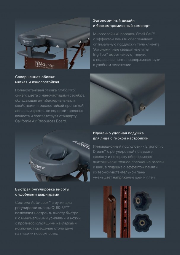 Благодаря конструкции "Big Top" и матрасу толщиной 6,5 см из уникального многослойного пеноматериала Multi-Layer Small Cell™ Foam, стол дарит максимальное удобство. Прямоугольные углы способствуют лучшему расслаблению плечевой зоны. Обивка цвета королевский синий устойчива к маслам и воде, не содержит вредных CFC, что гарантирует долговечность и безопасность этого профессионального оборудования.